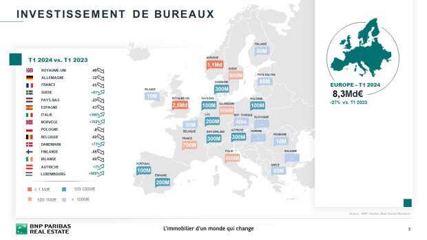 « Dans l’anticipation des baisses de taux, les investisseurs commencent à se positionner sur des immeubles très prisés par les utilisateurs, c’est à dire des actifs de premier choix, situés à des emplacements clés. L’activité devrait s’amplifier au fil des mois et la tendance se poursuivre en 2025, laissant entrevoir le début d’un nouveau cycle pour le marché des bureaux en Europe. Il s’agit donc d’un moment optimal pour investir », observe Argie Taylor, Head of International Investment Group (IIG) de BNP Paribas Real Estate.