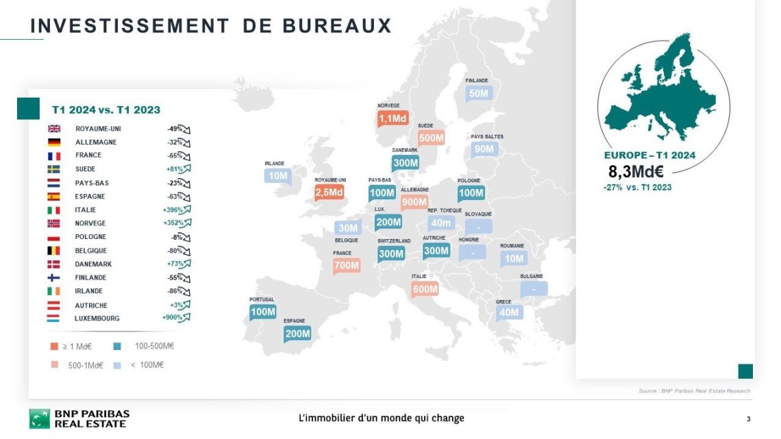 En 2023, le marché immobilier de bureaux en Europe a enregistré la plus importante baisse en volumes investis parmi toutes les classes d’actifs. Au terme du premier trimestre 2024, le secteur semble reprendre quelques couleurs, soutenu par une demande placée qui se consolide, malgré des disparités géographiques, d’après les chiffres de BNP Paribas Real Estate.