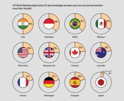 Selon l’étude conduite pour HP, seul 1 employé sur 5 en France (21 %) reconnaît avoir une bonne relation avec son travail. Ce premier HP Work Relationship Index* adresse les knowledge workers, concept défini par Peter Drucker et que l’on peut grossièrement résumer par les métiers en « col blanc », et est issu d’un sondage auprès de 15 600 personnes (principalement des travailleurs mais aussi des décideurs informatiques et des chefs d’entreprises).