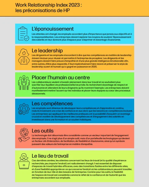 D’après le HP Work Relationship Index, il est primordial pour les organisations de veiller prioritairement aux six points de vigilance énoncés pour améliorer le rapport au travail.